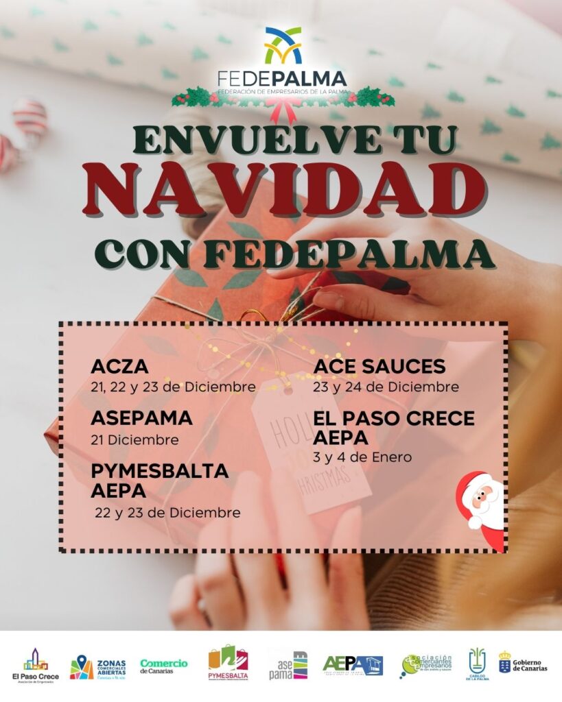 La actividad se desarrollará los días 21,22 y 23 de Diciembre en los Llanos de Aridane de la mano de ACZA y también el día 21 en Villa de Mazo de la mano de ASEPAMA, los días 22 y 23 en Breña Alta con PYMESBALTA y en Santa Cruz de La Palma con AEPA. El 23 y 24 de Diciembre en San Andres y Sauces con ACE. Finalizando el 3 y 4 de Enero de 2025 en el Paso con El Paso Crece y nuevamente con AEPA . Esta iniciativa que se pone en marcha desde Fedepalma es para facilitar el trabajo a todos los establecimientos asociados, pues se dará un mayor dinamismo a la hora de atender a más personas, al facilitarles que en esos puntos que se indicaran, los clientes puedan envolver sus paquetes y así facilitar la labor de nuestros comercios que en esos días son muchos los paquetes que tienen que realizar.