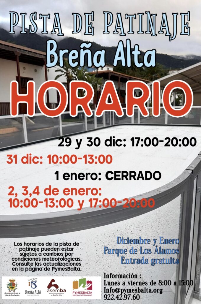 Breña Alta estas Navidades suma a su variado programa de actividades navideñas este año como novedad una pista de patinaje sobre hielo sintético, que se instalará en la Plaza de Los Álamos del 5 de diciembre de 2025 al 31 de enero de 2026. La gestión de esta actividad correrá a cargo de la Asociación de Empresarios Pymesbalta, a través de un convenio de colaboración con el Ayuntamiento de Breña Alta.