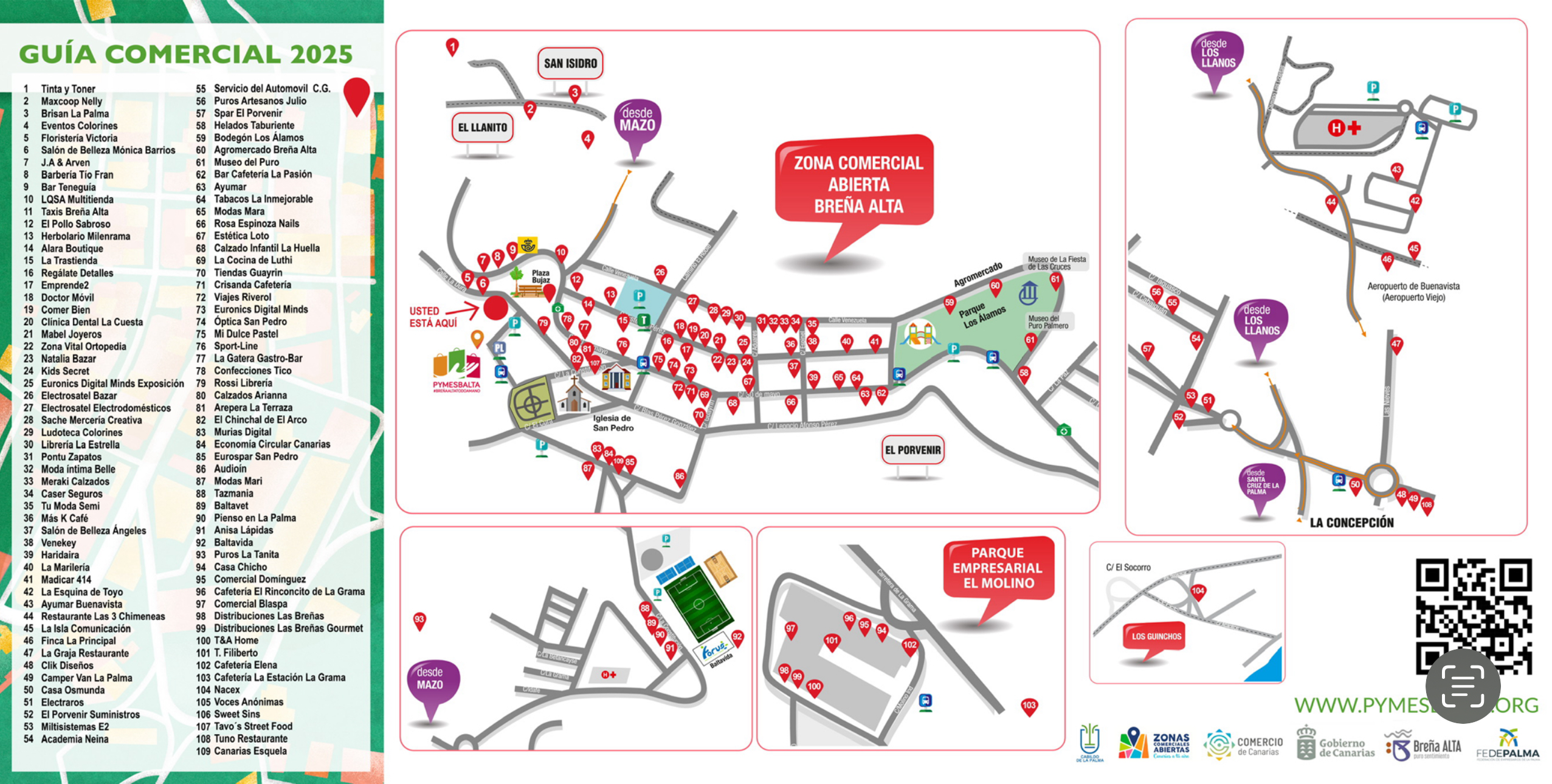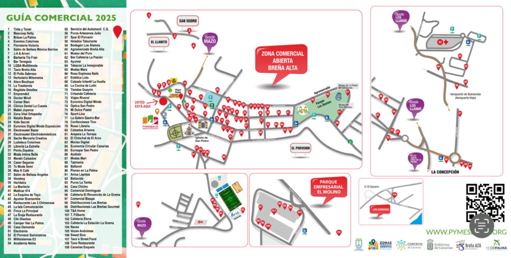 Además, se ha incorporado un código QR que enlaza directamente con la página web de Pymesbalta, donde los usuarios pueden obtener más información sobre las empresas, las campañas comerciales activas y otros servicios que se ofrecen. Esta actualización, que forma parte de la planificación anual de Pymesbalta, tiene como objetivo facilitar el acceso a la oferta comercial de Breña Alta y mejorar la visibilidad de las empresas locales.
