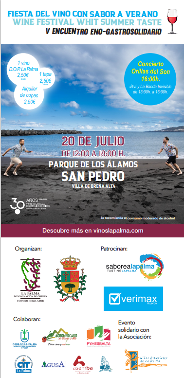 La Fiesta del Vino con Sabor a Verano tendrá lugar el sábado 20 de julio en La Villa de Breña Alta. Destacar el carácter insular del evento en el que se darán cita diez bodegas: Una bodega de Garafia, una de Puntagorda, una de Tijarafe, dos de El Paso, dos de Fuencaliente, dos de Breña Baja y una de Villa de Mazo para darnos a degustar vinos de las marcas, Teneguía/Llanos Negros, mil7 ochentaynueve, Vega Norte,Tamanca, Aceró, Viñarda, Piedra Jurada, Azul Perdido, Viña Etna y MERGUS, quedando de este modo representados todos los municipios de la isla que cuentan con bodegas, activas, acogidas a La Denominación de Origen de Vinos La Palma.