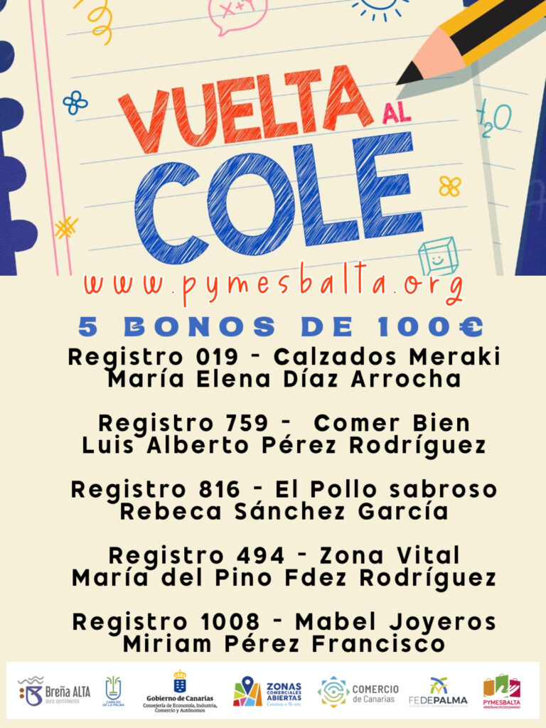La Asociación de Empresarios de Breña Alta, Pymesbalta, llevó a cabo hoy a las 10:00 horas, en el Salón de Plenos del Ayuntamiento de Breña Alta, el sorteo de la campaña “Vuelta al Cole”, en la que se entregarán 5 bonos de 100€ entre los clientes que realizaron sus compras en los comercios y empresas del municipio pertenecientes a dicha asociación.