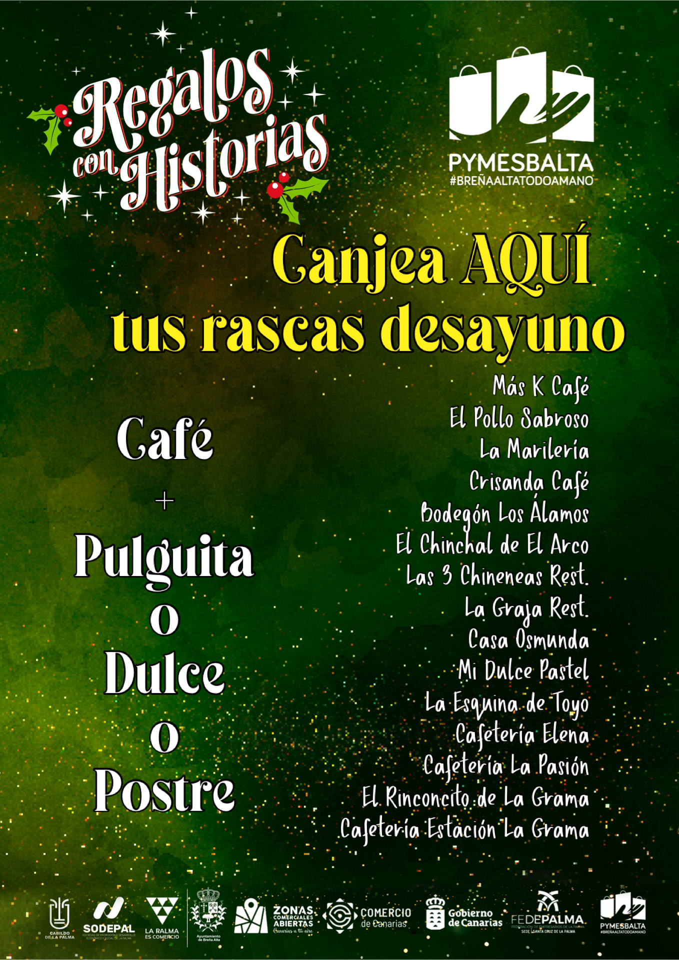 La Asociación de Pequeña y Mediana Empresa de Breña Alta (Pymesbalta) dentro de la campaña navideña “Regalos con Historias” que promueve el Cabildo de La Palma, vuelve con rascas de premios directos que incluyen desayunos gratis en colaboración con cafeterías y restaurantes locales. La campaña, que se enmarca dentro de las actividades navideñas del municipio, tiene como objetivo impulsar el comercio local y premiar la fidelidad de los consumidores.